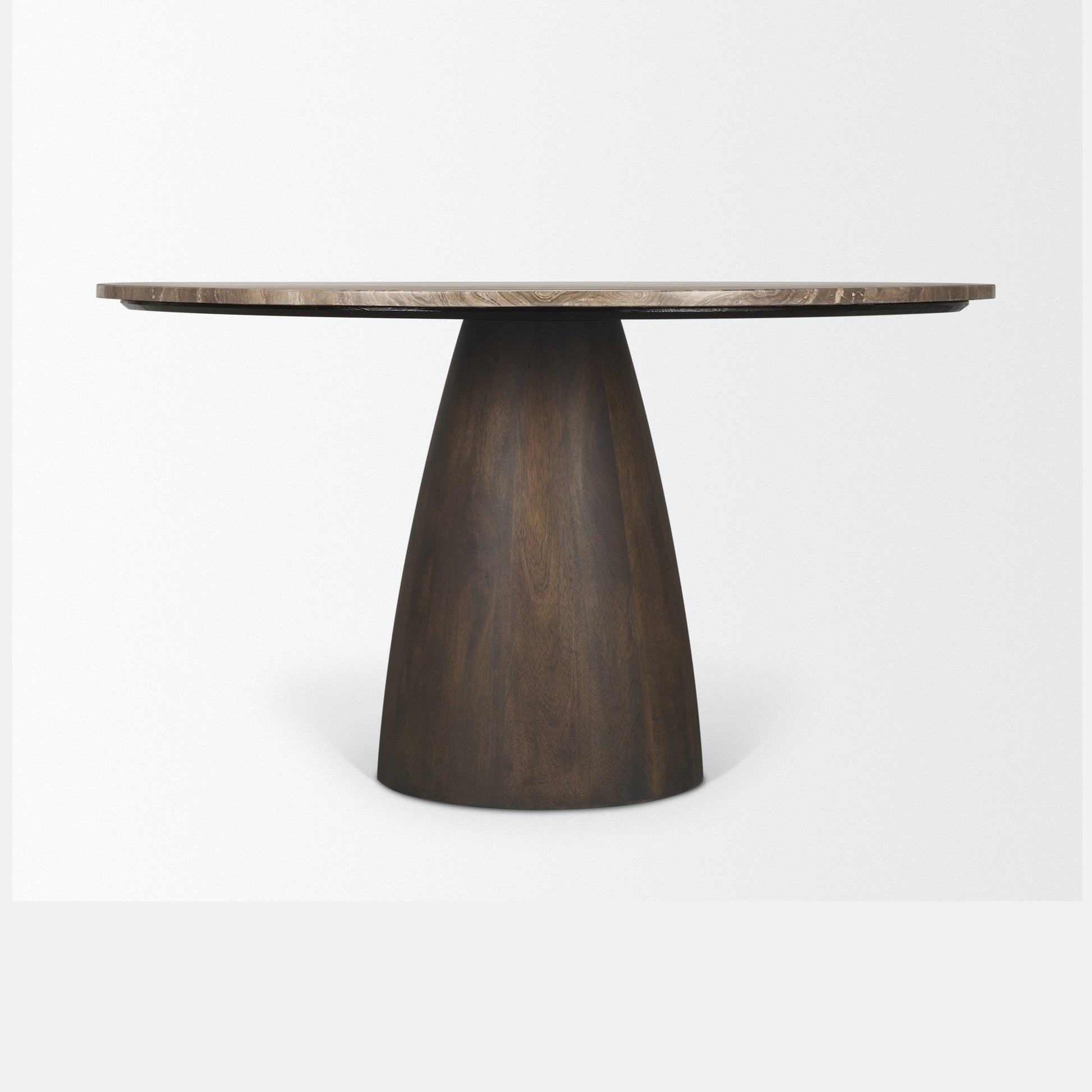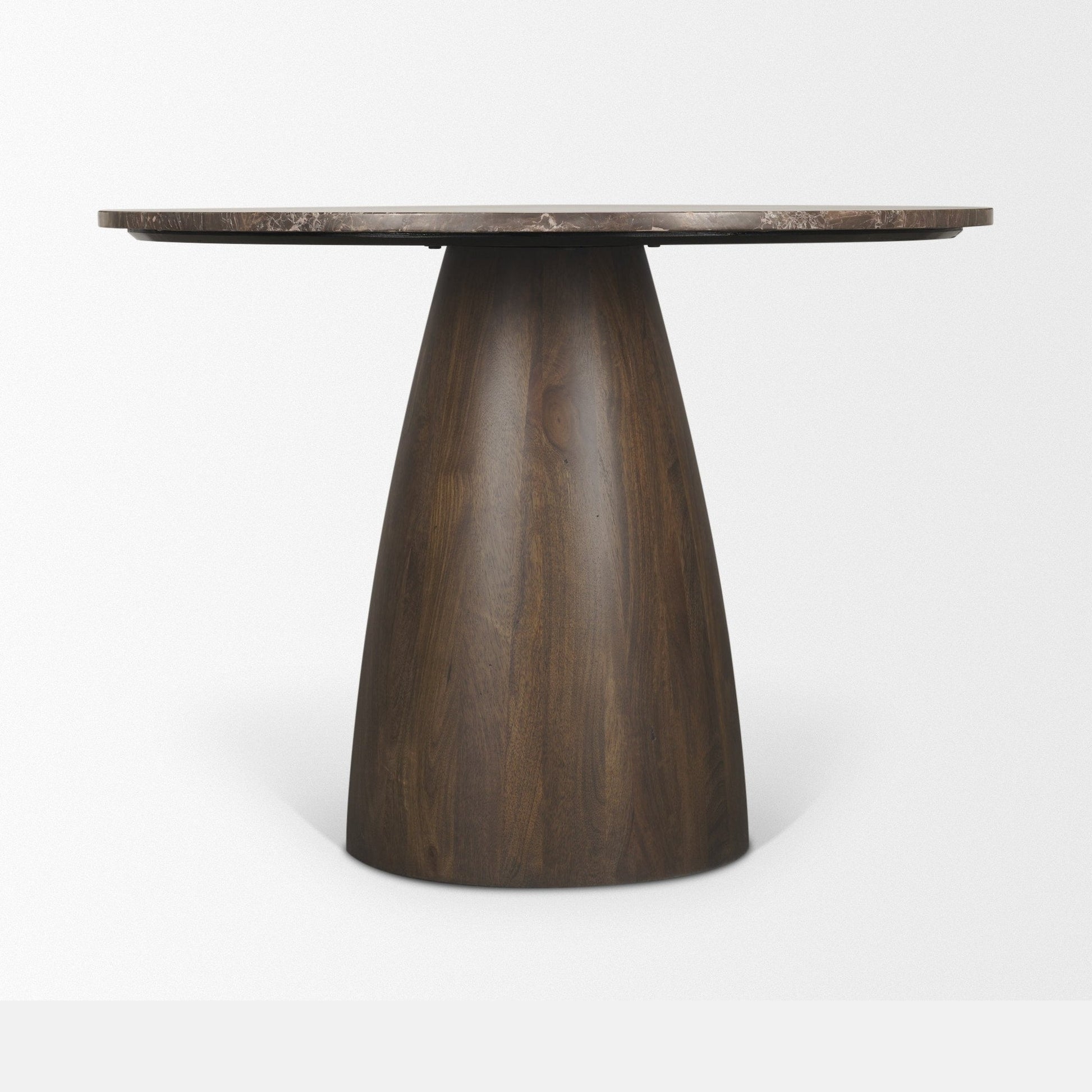 - Allyson Bistro Table 32": Compact yet refined, the Bistro version brings sculptural elegance to smaller spaces. Its Cappuccino Brown marble top showcases fluid swirls of earthy tones with cream undertones, setting a warm, inviting mood for intimate meals or coffee moments. The solid wood pedestal base, finished in mid‑dark brown, mirrors the marble’s natural flow with subtle curves. Available in Cappuccino Brown and Bold Pink Marble, the Bistro table delivers everyday elegance in a more personal scale.