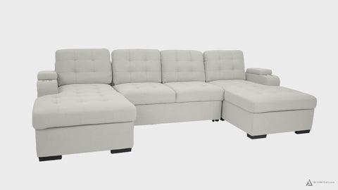 The Alonso Sleeper Sectional offers generous seating and a timeless design that fits well in any modern living room. Upholstered in light grey fabric, it features clean lines and a minimal silhouette that blends easily with contemporary décor. The pull-out bed provides extra sleeping space for guests, while dual storage chaise compartments keep linens and essentials neatly tucked away. Its U-shaped layout is perfect for lounging, hosting, or relaxing with family.