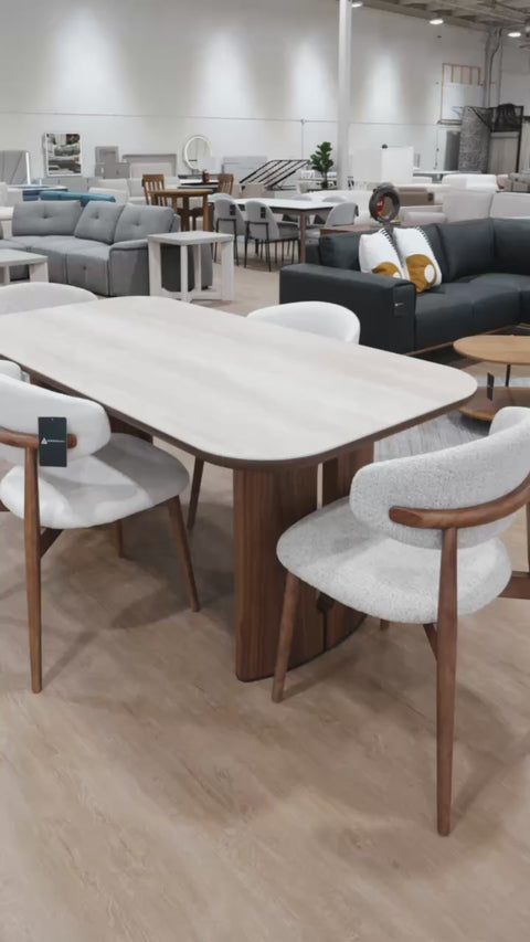 Upgrade your dining space with the Atticus Dining Table, a refined blend of natural textures and contemporary design. Its 6mm off-white travertine-look ceramic top mimics the timeless beauty of stone while offering heat, stain, and scratch resistance. The sturdy MDF base is finished in rich walnut veneer, adding warmth and visual depth. With a sleek rectangular shape and spacious surface, Atticus comfortably seats six and suits both modern and transitional interiors