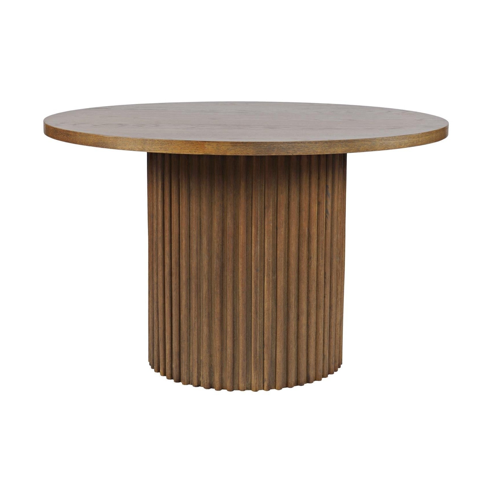 The Auden 48" Round Dining Table in Chestnut brings timeless warmth and casual elegance to your dining space. Designed as part of the Ellington Collection, this table features a beautifully crafted round tabletop paired with a sturdy sculptural base. Finished in a rich chestnut tone, the Auden table is constructed with durable engineered wood and premium American white oak veneer, accented by solid rubberwood fluted details. Ideal for everyday dining, this table comfortably anchors casual dining rooms and breakfast areas with style and durability.