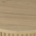 The Auden Coffee Table in Natural features a clean, circular tabletop crafted from MDF with American white oak veneer, giving a refined contemporary appearance. Its distinctive fluted base is made from solid rubberwood, adding subtle texture and sturdy support. This carefully designed coffee table combines elegant simplicity with durable materials to enhance any living space with timeless style and functionality.