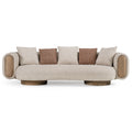 Upholstered in a textured performance fabric and paired with solid rubberwood accents in a natural finish, this sofa delivers both beauty and durability. Its deep seat and supportive cushioning make it perfect for entertaining, lounging, or bringing refined softness into your space. With five plush toss pillows in coordinating neutral and terracotta tones, Aylin offers an inviting, designer-inspired presence that transforms any interior.