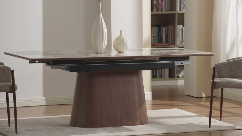 The Bastian Extension Dining Table combines modern functionality with timeless elegance. Featuring a durable MDF tabletop finished with ceramic, offering the same refined aesthetic as our Fair collection, this table sits atop a stunning walnut wood veneer base in walnut finish. The innovative middle-flipped extension mechanism allows you to seamlessly expand the table to accommodate extra guests, making it perfect for both intimate dinners and larger gatherings. Ideal for contemporary and transitional dining spaces.