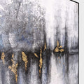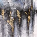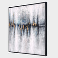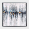 Compliment your space with this soft and moody hand painted abstract canvas. Featuring soft grays contrasted with pops of blue and gold leafing, finished in a black floater frame. A beautiful piece to display in a bedroom, living room or office.