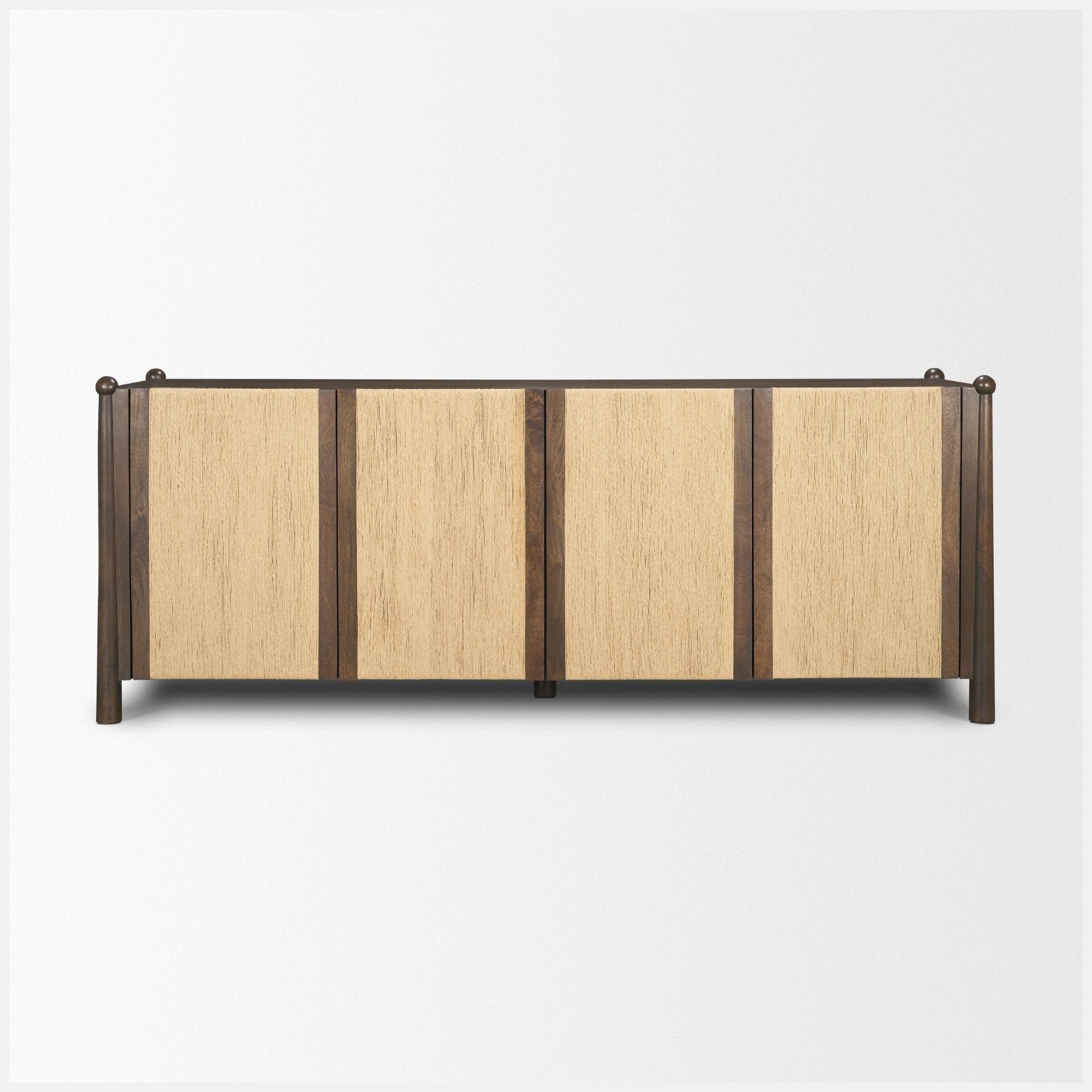 The Bondi 4‑Door Closed Sideboard brings relaxed texture and practical storage together in a clean, modern form. Dark wood framing surrounds woven natural paper rope doors, creating depth through contrast and fine patterning. Inside, ample shelving offers space for serveware, décor, or media essentials while maintaining an open, coastal sensibility. Versatile and grounded, the Bondi sideboard anchors dining and living spaces with quiet, tactile character.