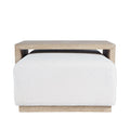 Features: Sliding Wood Top, Built-in hidden casters, and a soft textured upholstery fabric.