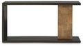 With its clean lines and sense of simplicity, this console table is a master study in modern style. We love how the contrasting patchwork patterned post and the dark brown finish captivate the eye. The lower shelf enhances the open and airy design and provides great display space.