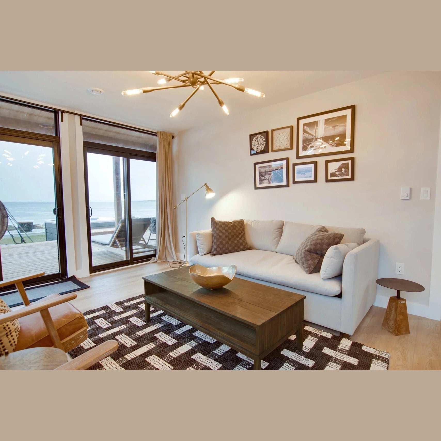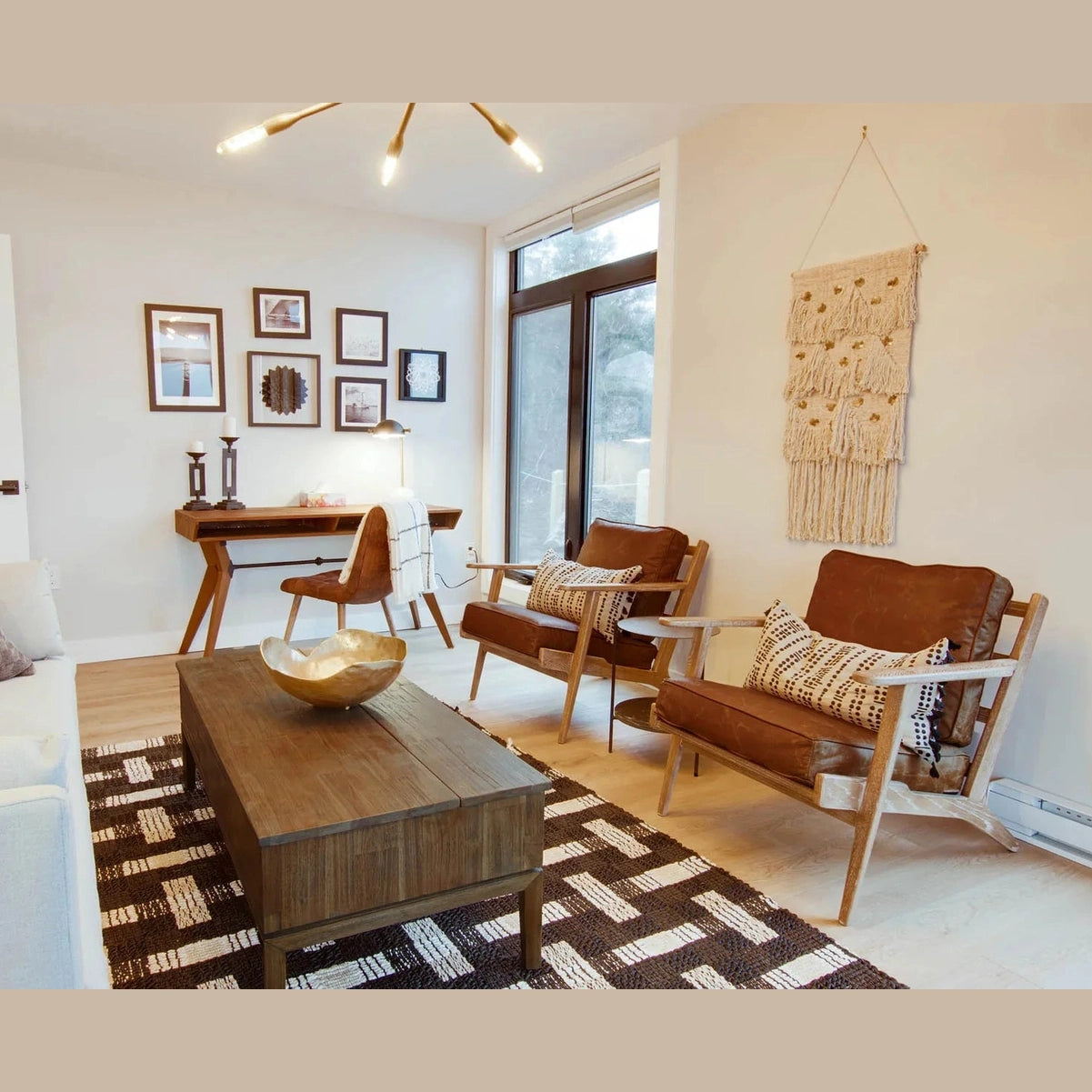 The Ciro Coffee Table with Lift Top is made from acacia wood with a warm brown finish and vertical ridges for added texture. It features a lift-top mechanism that reveals hidden storage, including four compartments and a front niche. The top lifts to 25.75 inches, making it suitable for working or casual dining. Designed to support up to 44 lbs, it combines style and practicality for modern living spaces.