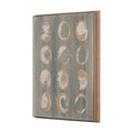 "Equilibra I" by Studio M is a captivating exploration of symmetry and texture, featuring twelve ethereal ovals set against a muted gray backdrop. Hand-embellished with earthy tones and crackle-like textures, each form evokes a sense of organic, evolving beauty. The piece is elegantly framed in sleek, dark wood, adding a touch of warmth and sophistication to its avant-garde presentation.