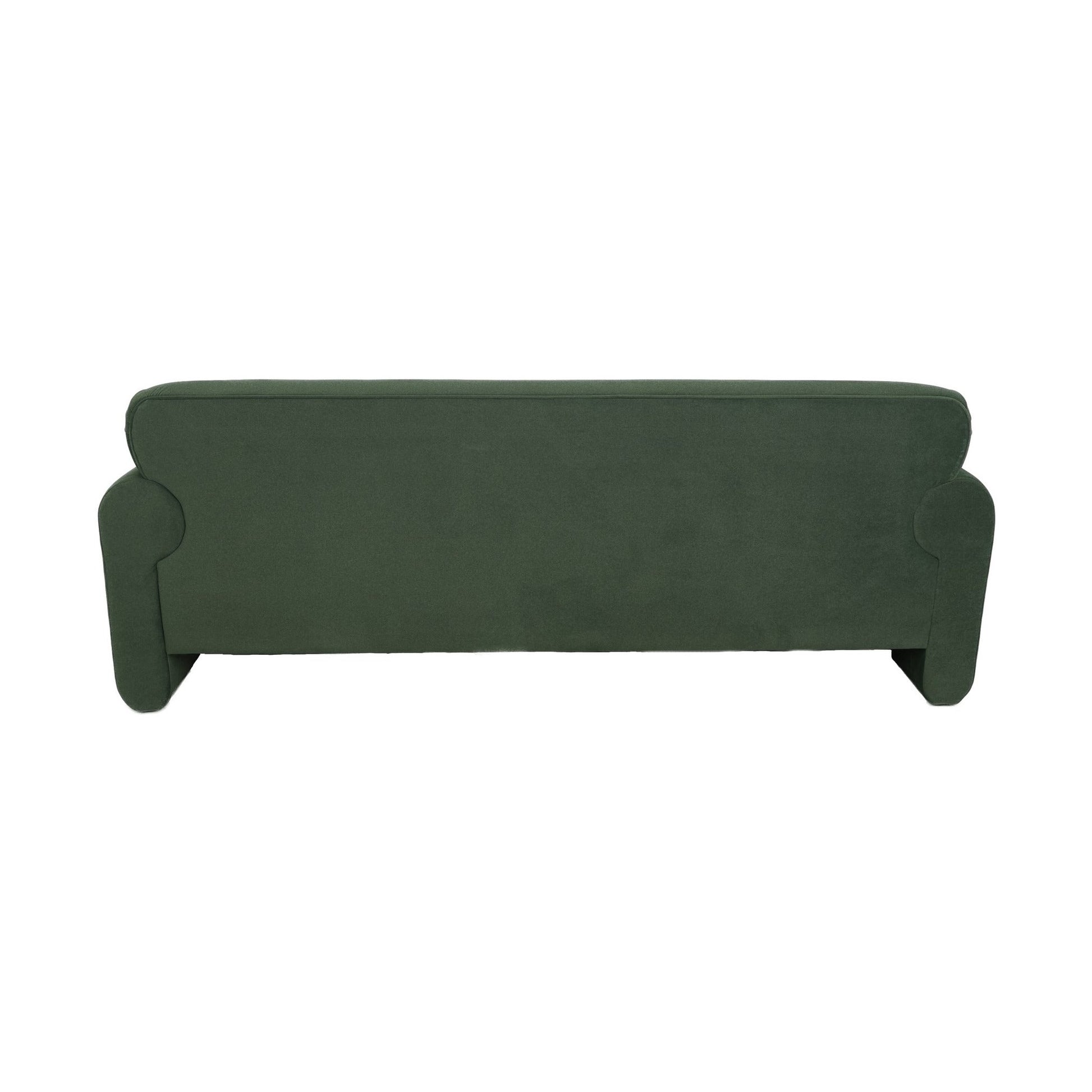 The modern version of a traditional roll-arm sofa features voluminous shapes and unique forms. Instead of a standard outward roll, the arms and legs come together in a single, sculptural design that creates fascinating connections at the back. A plush box cushion defies gravity, providing a cozy spot to curl up. Luxe faux mohair drapes over the curves, adorned with gathered pleating for added detail.