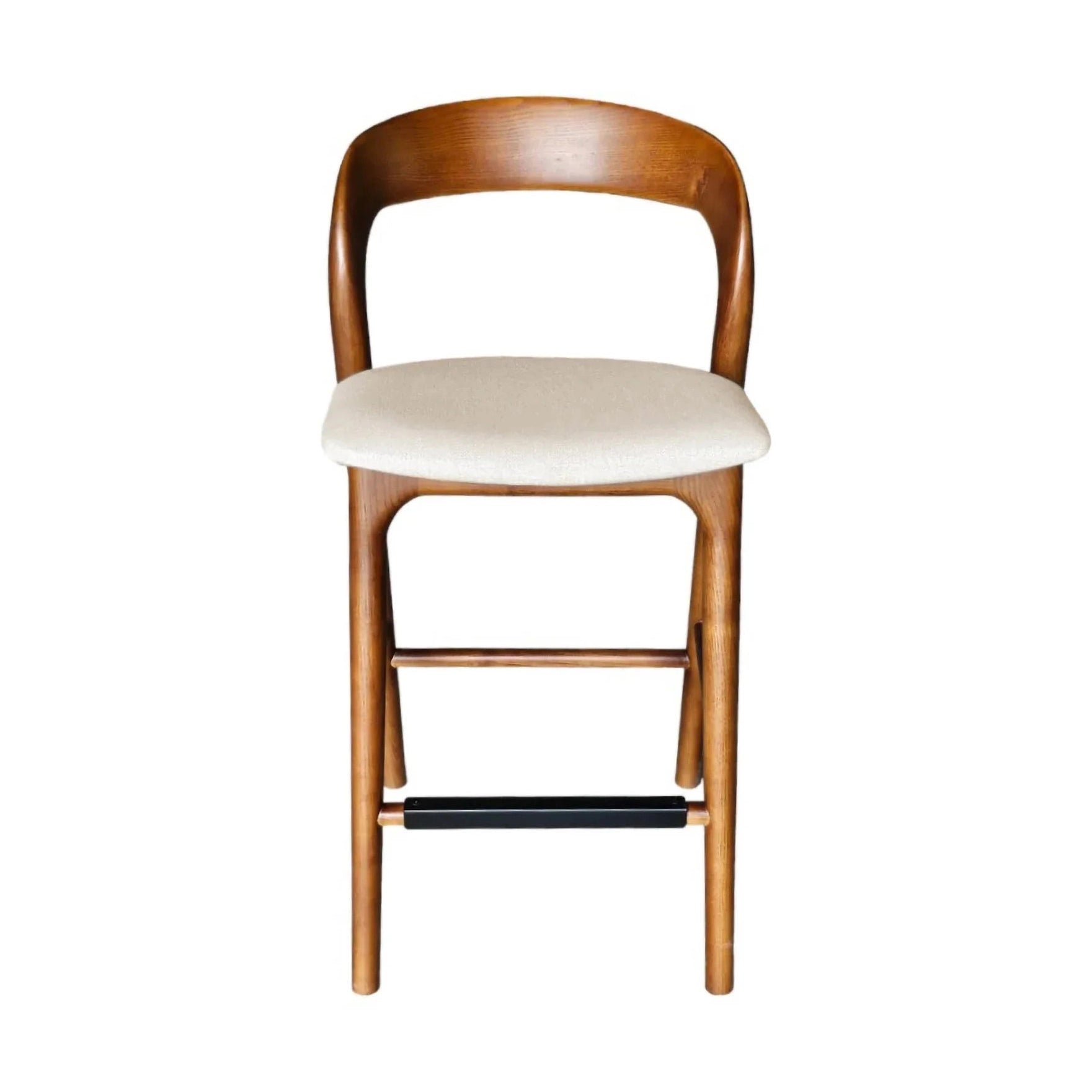 This Counter Stool, crafted from a solid ash wood frame, featuring a seat cushion upholstered in 100% polyester fabric. The stool offers both comfort and durability, making it a perfect addition to any dining space. A black metal bar in the footrest enhances durability and protects against wood scratches, ensuring lasting quality.