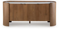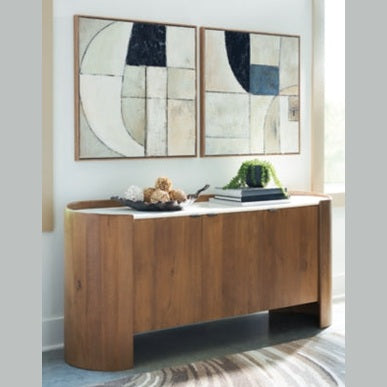 This stunning accent cabinet combines modern design with sophisticated materials. Its natural finish and sleek white marble top create an elegant contrast, while the unique rounded silhouette adds a touch of contemporary flair. Three doors open to reveal shelves and storage space, making this piece as practical as it is beautiful.