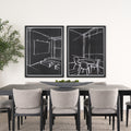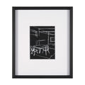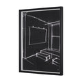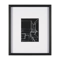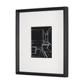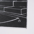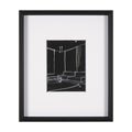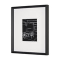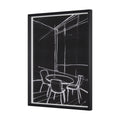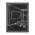 "Interior Sketch  V & VI" by Mercana Studio is a captivating art print that unveils a minimalist architectural outline against a sleek black canvas. Rendered with bold white strokes, the geometric forms suggest an urban interior space, embodying modern sophistication. Thoughtfully hand-embellished for added texture and depth, the piece is perfectly encased under glass and bordered by an elegant frame, offering a refined yet contemplative visual experience.