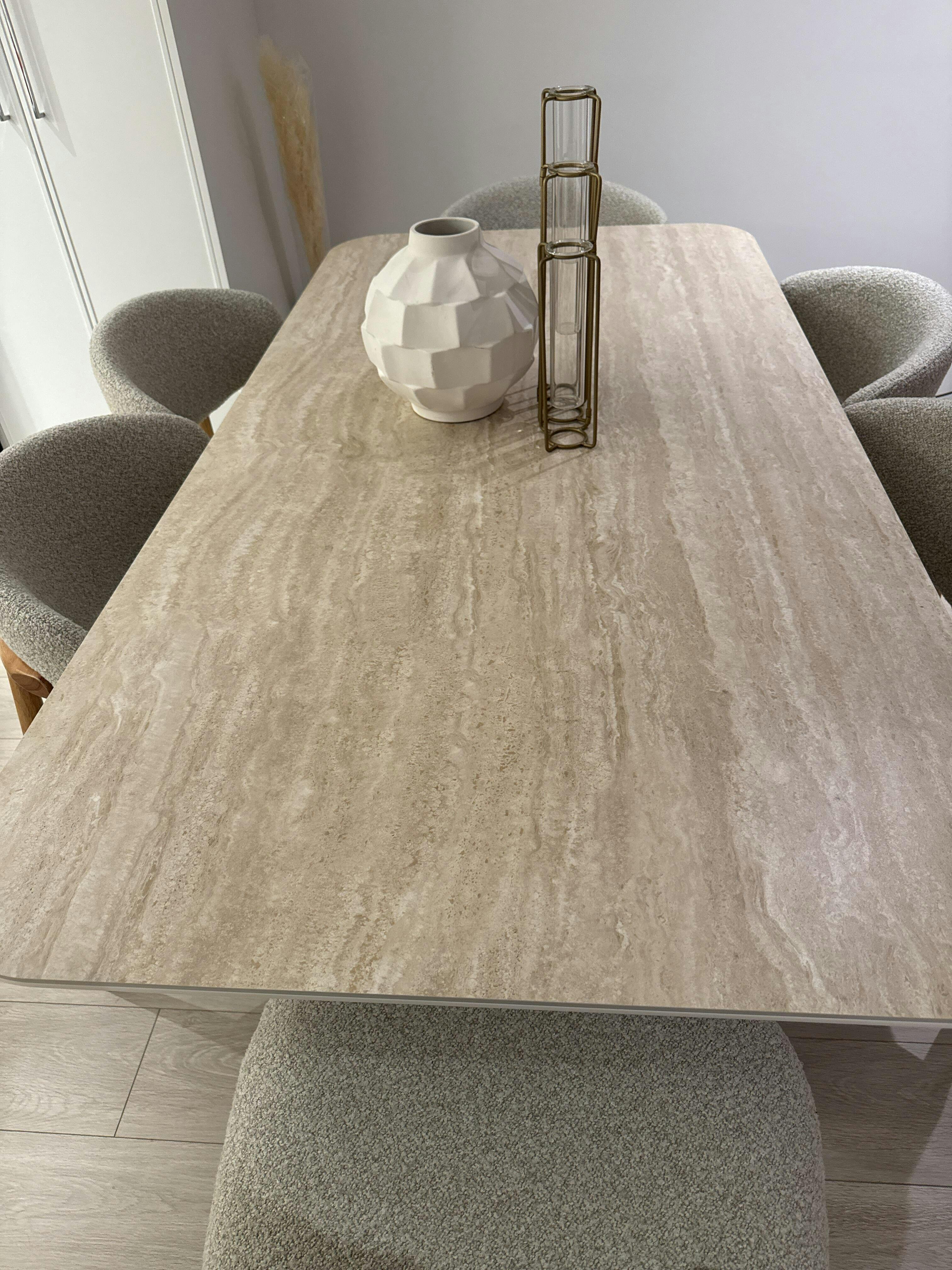 The Kasia Dining Table blends refined materials with minimalist design. Its 6mm travertine ceramic surface is layered over a durable MDF top, delivering a stone-like texture that’s both elegant and easy to maintain. Supported by metal legs coated in light grey powder with a smooth sanding finish, the table offers a sleek silhouette that suits modern and transitional interiors. Ideal for everyday meals and stylish entertaining, Kasia is built to last while elevating your space.