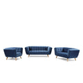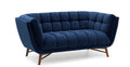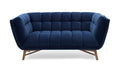 Velvet Dark Blue (#28) – Elegant dark blue velvet with mid-century hardwood legs, embodying craftsmanship and luxury.