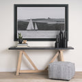 "Maritime Meander" by Ben Wood is a captivating monochrome photograph capturing a sailboat gracefully navigating along a rugged coastline. The timeless black and white palette enhances the textural contrast between the smooth sails and the craggy cliffs. This piece evokes the serene yet adventurous spirit of coastal exploration, a perfect embodiment of minimalist elegance.