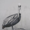 "Pelican Stories" by Nathan Larson is a captivating black-and-white photograph capturing the poised elegance of a solitary pelican perched on a weathered wooden post. The soothing grayscale tones enhance the serene backdrop of blurred marshland and water, evoking a sense of quiet contemplation. This artwork beautifully balances nature's grace with the timeless allure of monochrome photography.
