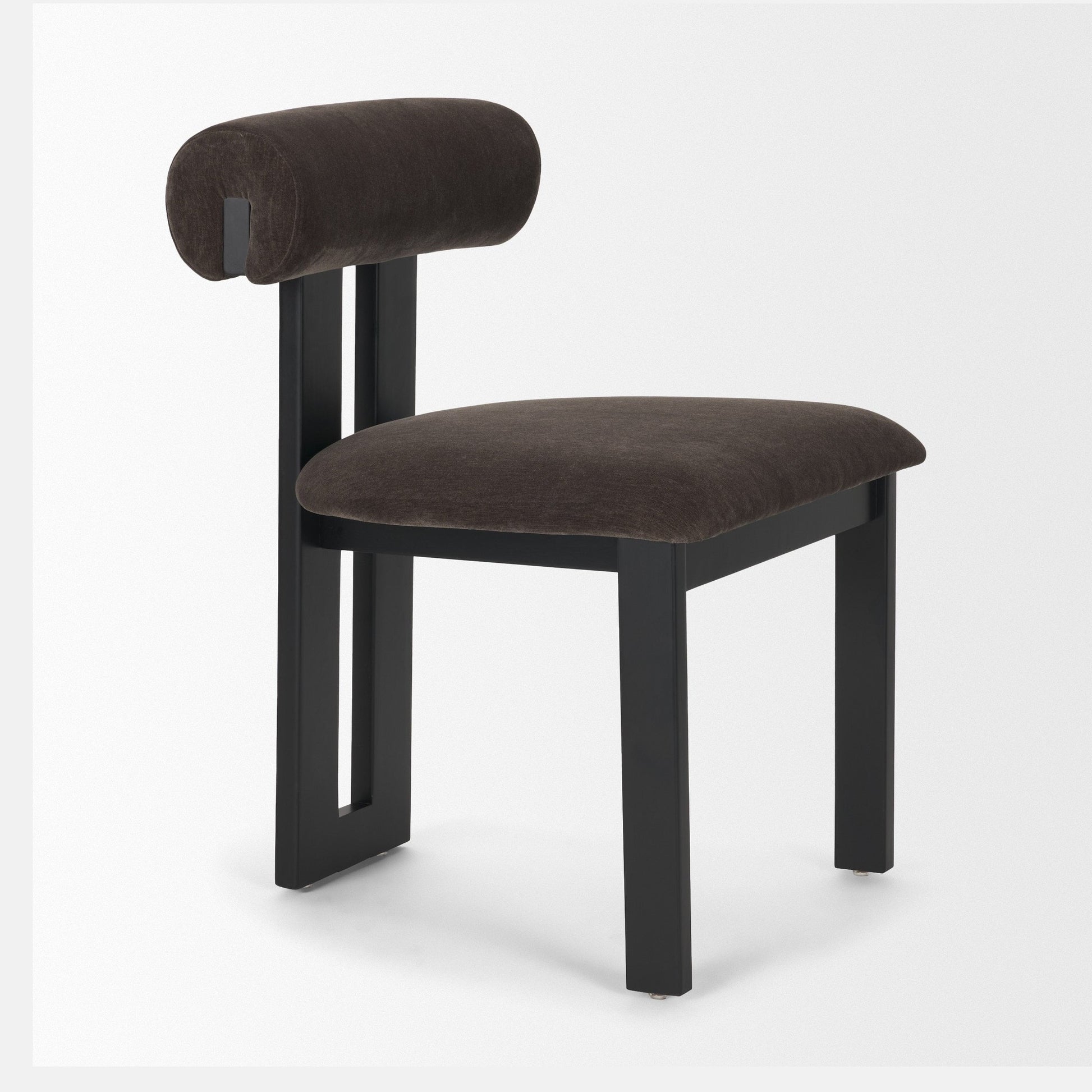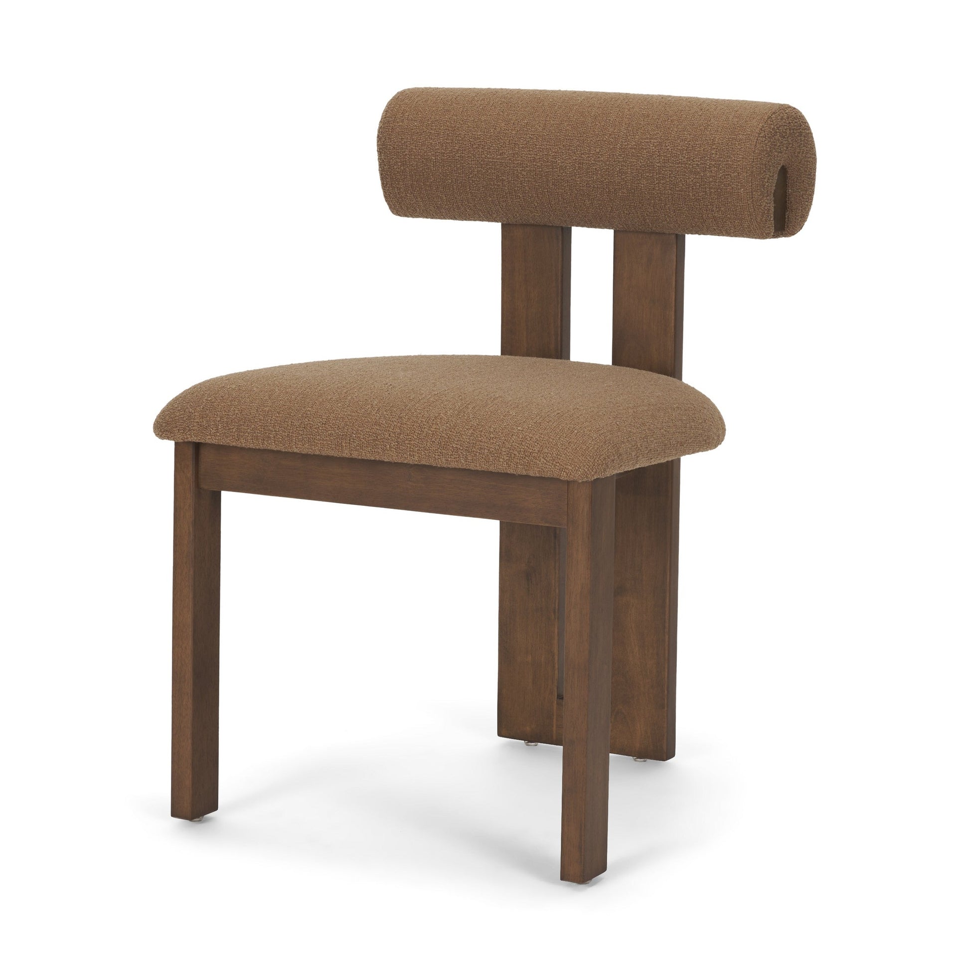 This dining chair balances soft curves with bold structure, featuring a rolled back, sculptural tripod base, and artful double-beam detail. Upholstered in performance-grade mocha fabric and grounded by a kiln-dried solid rubberwood frame, it delivers comfort, character, and modern elegance in equal measure.